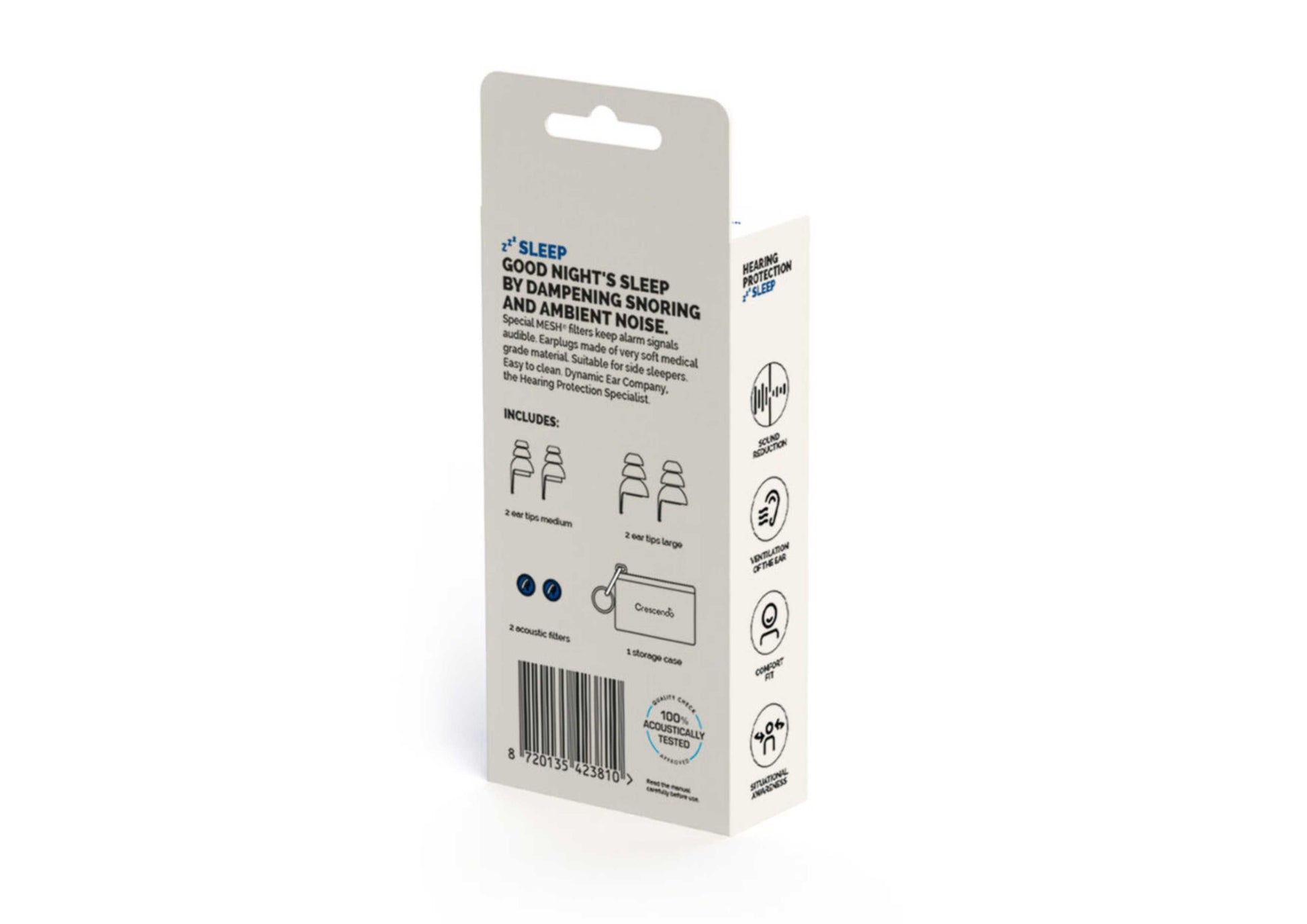 De Crescendo Sleep Eco oordoppen bieden een duurzame en comfortabele oplossing voor een ongestoorde nachtrust. Dankzij de speciale MESH-filters verminderen ze storende geluiden, terwijl alarmsignalen hoorbaar blijven. De oordoppen zijn ideaal voor zijslapers en worden geleverd in een volledig recyclebare verpakking, geproduceerd via een emissieneutraal proces.